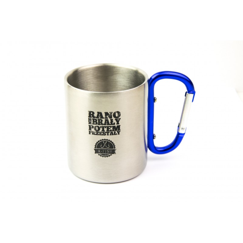 210 ml mug with a carabiner for attaching, double walls that slow down heat transfer to the outside, made of stainless steel
