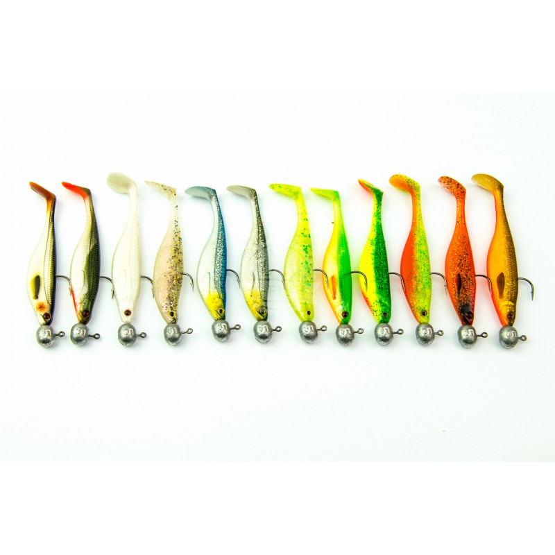 Zestaw zawiera 12szt gum shadteez 7cm w kolorze MIX uzbrojonych w główki jigowe w gramaturze 5g.