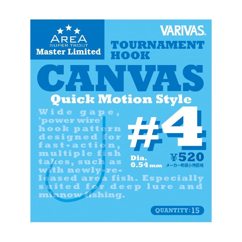 Haki bezzadziorowe japońskiego producenta firmy Varivas. Przeznaczone do łowienia na przynęty twarde takie jak woblery czy wahadłówki. Idealna propozycja dla zawodników biorących udział w zawodach typu Trout Area. W haki Canvas możemy uzbroić nawet najmniejsze przynęty twarde. Haczyli te są mega ostre wyposażone w spore oczko do mocowania kółka łącznikowego. Wytrzymałe a przede wszystkim nie gubiące ryb co jest elementem bardzo ważnym na zawodach Trout Area gdzie ilość ryb decyduje o wygranej turze.
